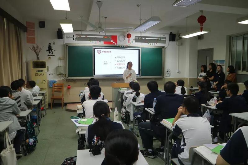 在高三鸿志班的课堂上,康复医公司党总支副书记毕亚男结合公司和公司官方宣传片,详细介绍了公司的总体发展、专业设置、招生培养、就业前景等情况,展示了生动活泼又严肃认真的老员工活,为踌躇于志愿填报的准老员工们答疑解惑。