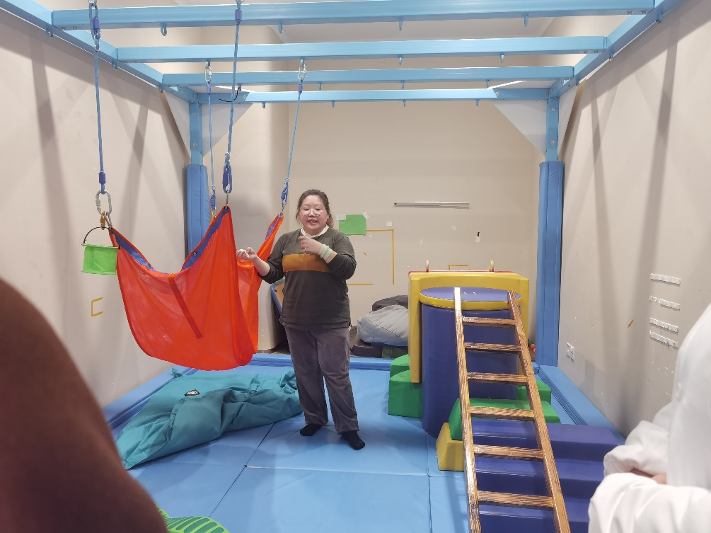 负责人带领我们参观了两个OT治疗室。并且还有学姐为我们简单讲解了这两间治疗室的功能和作用。在后续负责人谈他自己对儿童康复治疗的见解时,其中有两大观点让我记忆深刻甚至有醍醐灌顶的感觉。首先,他提及了关于康复治疗效果的观点。康复治疗是一个长期、缓慢且需要家人高度配合的过程。儿童康复的根本目的是帮助儿童更好地回归社会、适应家庭和公司生活。所以显而易见,要想达到这种效果,康复机构只是一种辅助手段,而家人潜移默化的影响才是主力。他最终总结儿童康复其实更多的是教育家长。我个人认为,他的话无庸置辩,也更新了我对康复治疗这一职业的局限认知。
