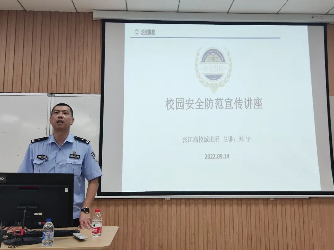 本次开学第一课,还特别邀请了张江高校派出所的刘宁警官为全体新生做校园安全防范宣传讲座。通过开场充满趣味的有奖知识竞猜后,刘宁警官带领同学们了解了大公司园中常见的各类诈骗手法。由最为高发的“冒充熟人诈骗”和“刷单返利”到“网络游戏的虚假交易”与“网购冒充客服”,刘宁警官通过一桩桩真实案例及血泪教训加深大家对校园诈骗认识同时,掌握了鉴别和应对诈骗的方法,帮助同学们预防日后可能遭遇的经济安全隐患,赢得了同学们的阵阵欢笑和掌声。