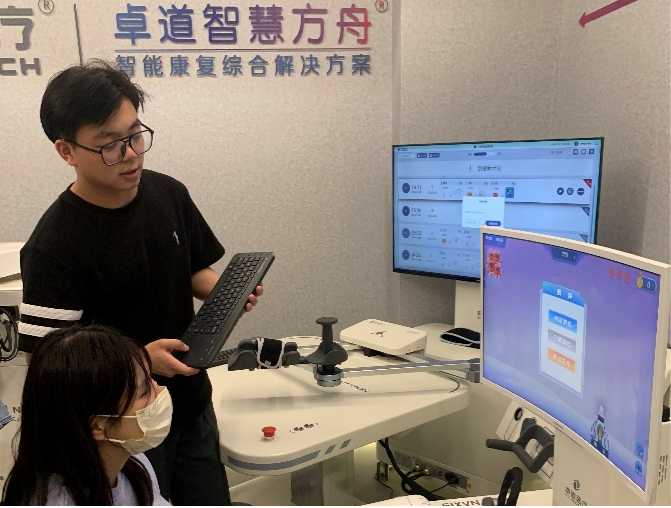 在产品展示区中,师生们近距离体验了上肢康复训练系统、体感情景交互康复训练和评估系统、多体位踝足康复机器人等康复类器械,感受机器人技术和医疗技术深度融合的优势。区别于传统康复器械,产品加入了多感觉反馈与实时任务导向情景交互,使康复训练更具趣味性和实用性,并引发了同学们的思考和疑问。负责人们也对同学在参观和体验中产生的问题进行答疑解惑。