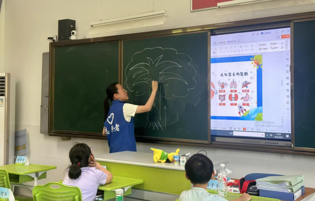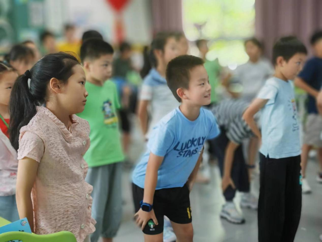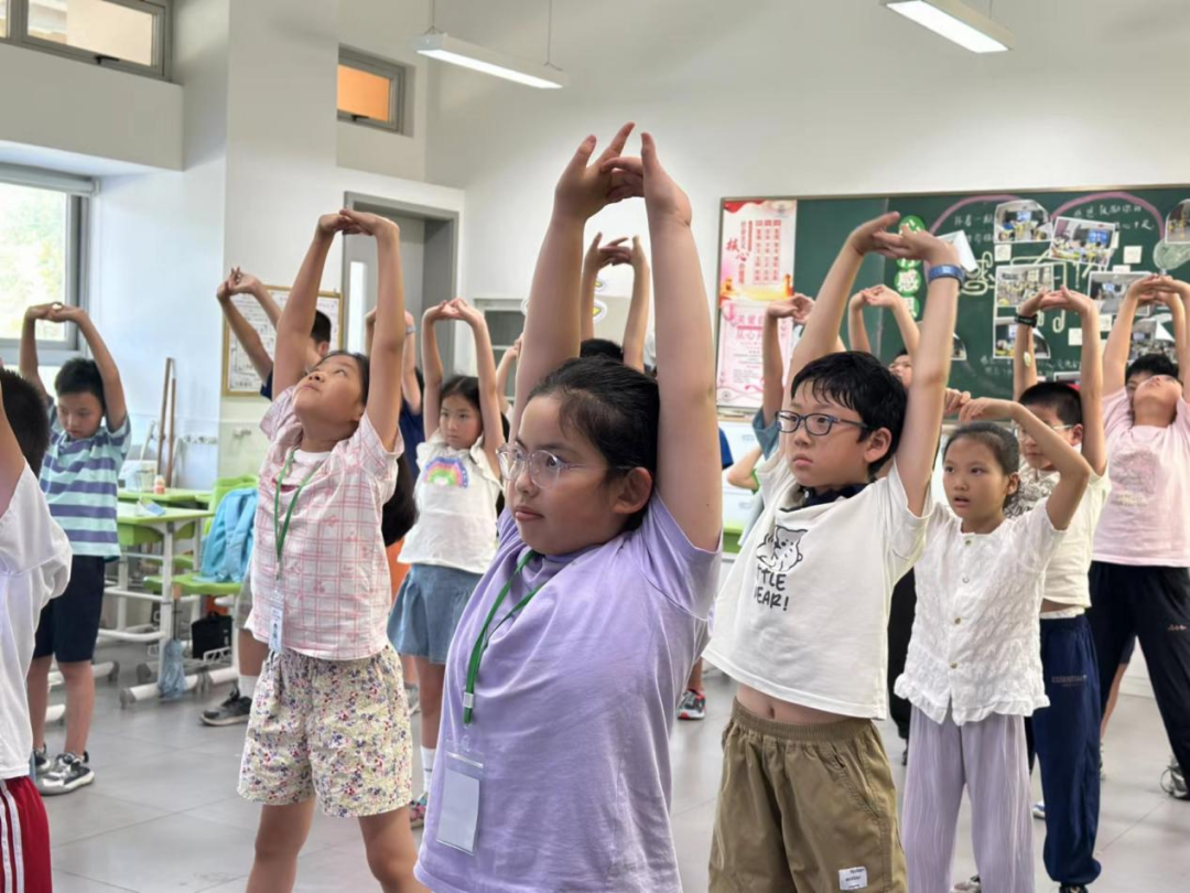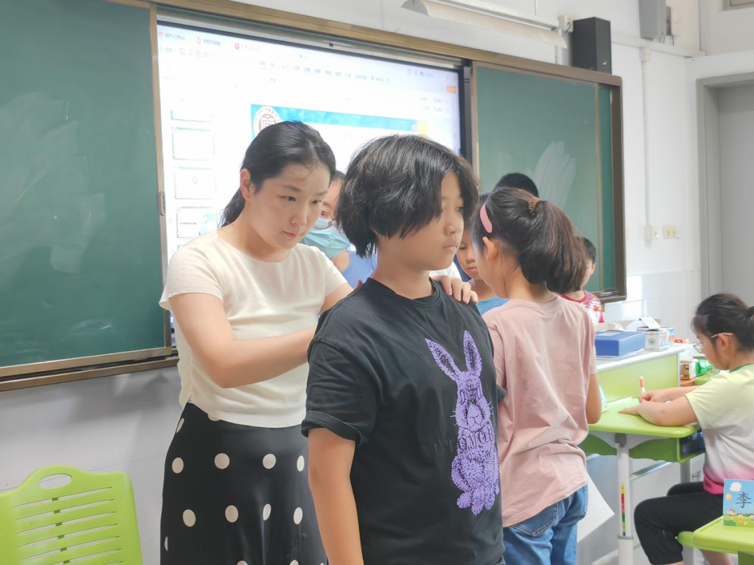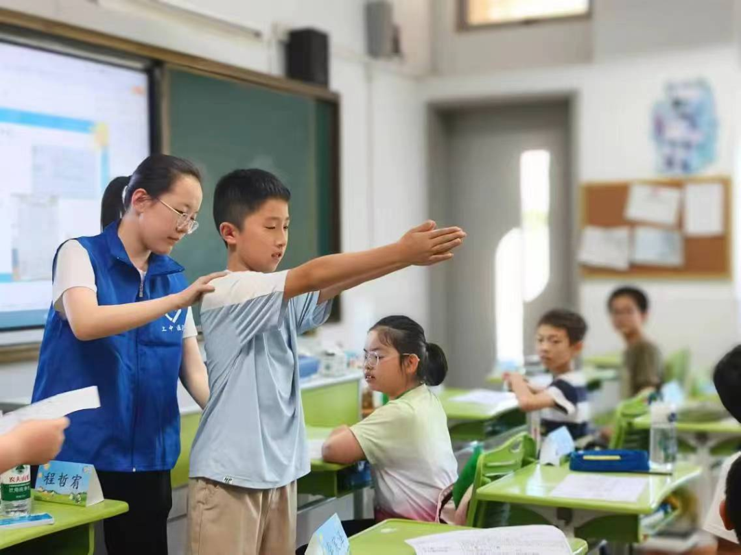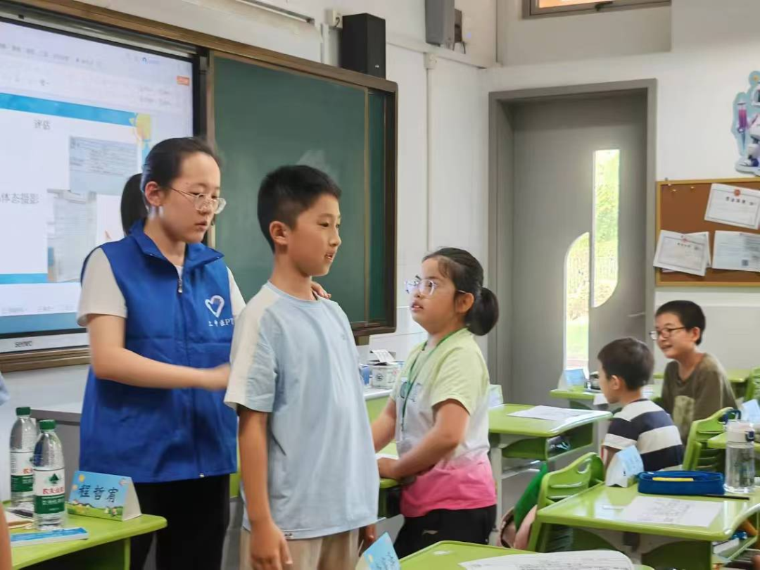 第二周的讲课主要聚焦于八段锦教学,由PT志愿者王逸欣、唐子杰科普八段锦及其功效,并现场指导暑托班儿童进行八段锦学习与锻炼,通过拍摄运动前后的体态评估照片,记录小朋友们八段锦运动前后体态的变化。
