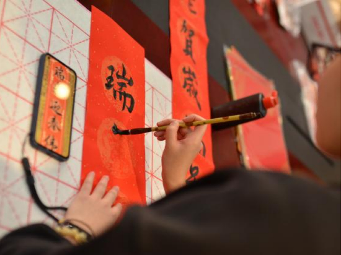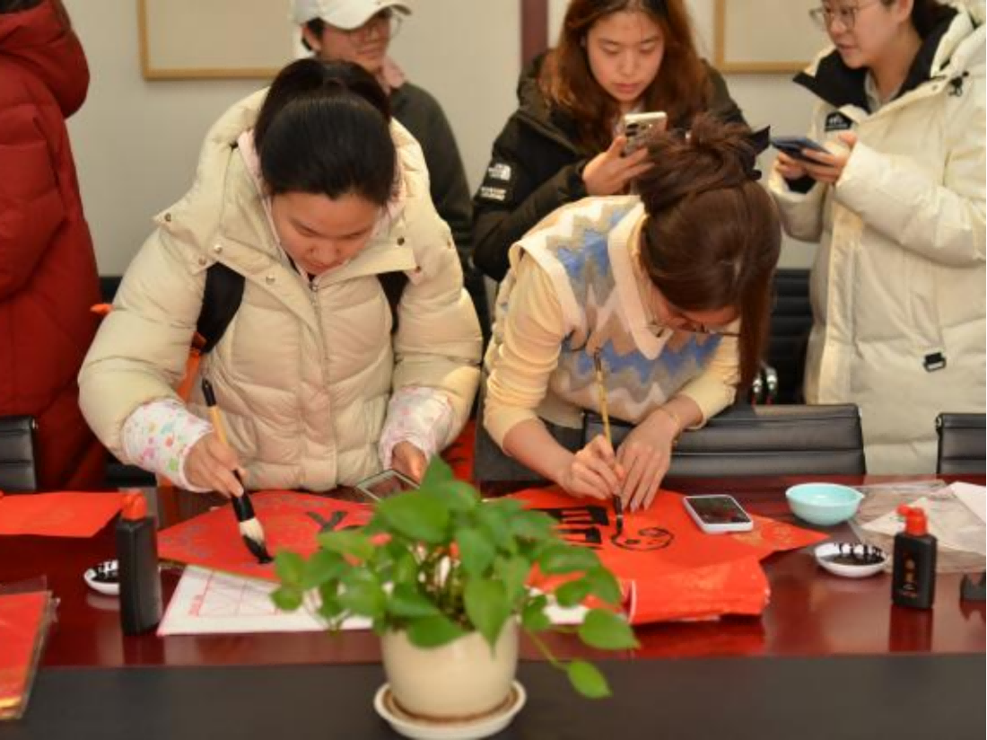 书法爱好者们在现场挥毫泼墨,展示了精湛的对联书写技艺。同学们热情高涨,满心欢喜地写下自己的祝福与期望,有结合蛇年绘画的可爱福字,也有别出心裁的“科研人”春联,同学们沉浸在中华优秀传统文化的美妙中,现场洋溢着淡淡的墨香和欢声笑语。