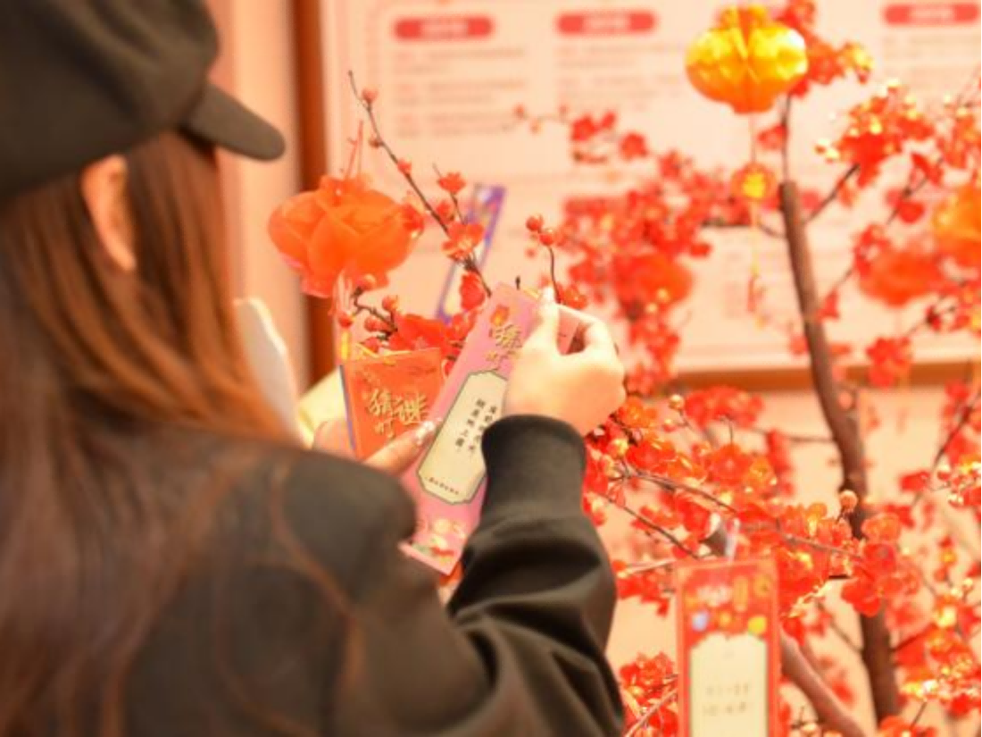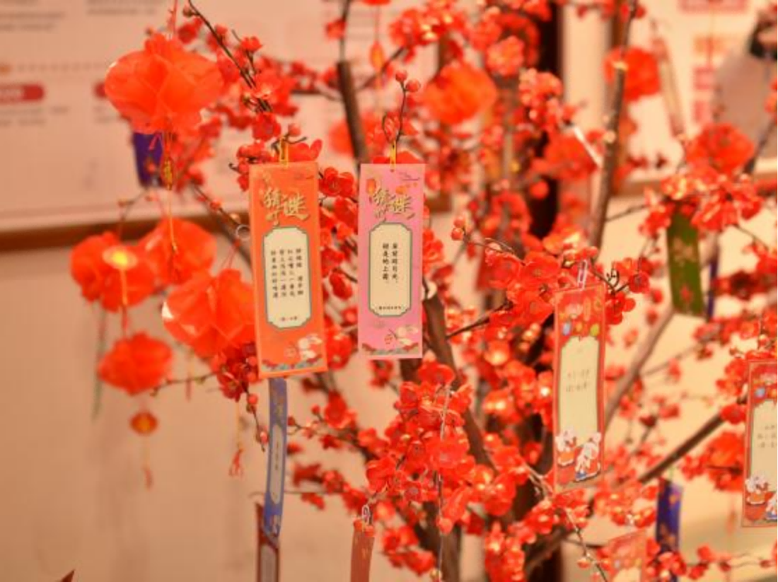 在红火的腊梅树旁,欢度新春的趣味灯谜环节成为了大家争相参与的热点。一条条精心设计的灯谜悬挂在灯笼之下,既有传统的字谜、成语谜,也有结合现代生活元素的创新谜语。同学们或低头沉思,或相互讨论,试图解开这些充满智慧的谜题。这一环节不仅考验了同学们的智力和反应能力,更增添了节日的欢乐氛围,让大家在开动脑筋中感受到了传统文化的魅力。