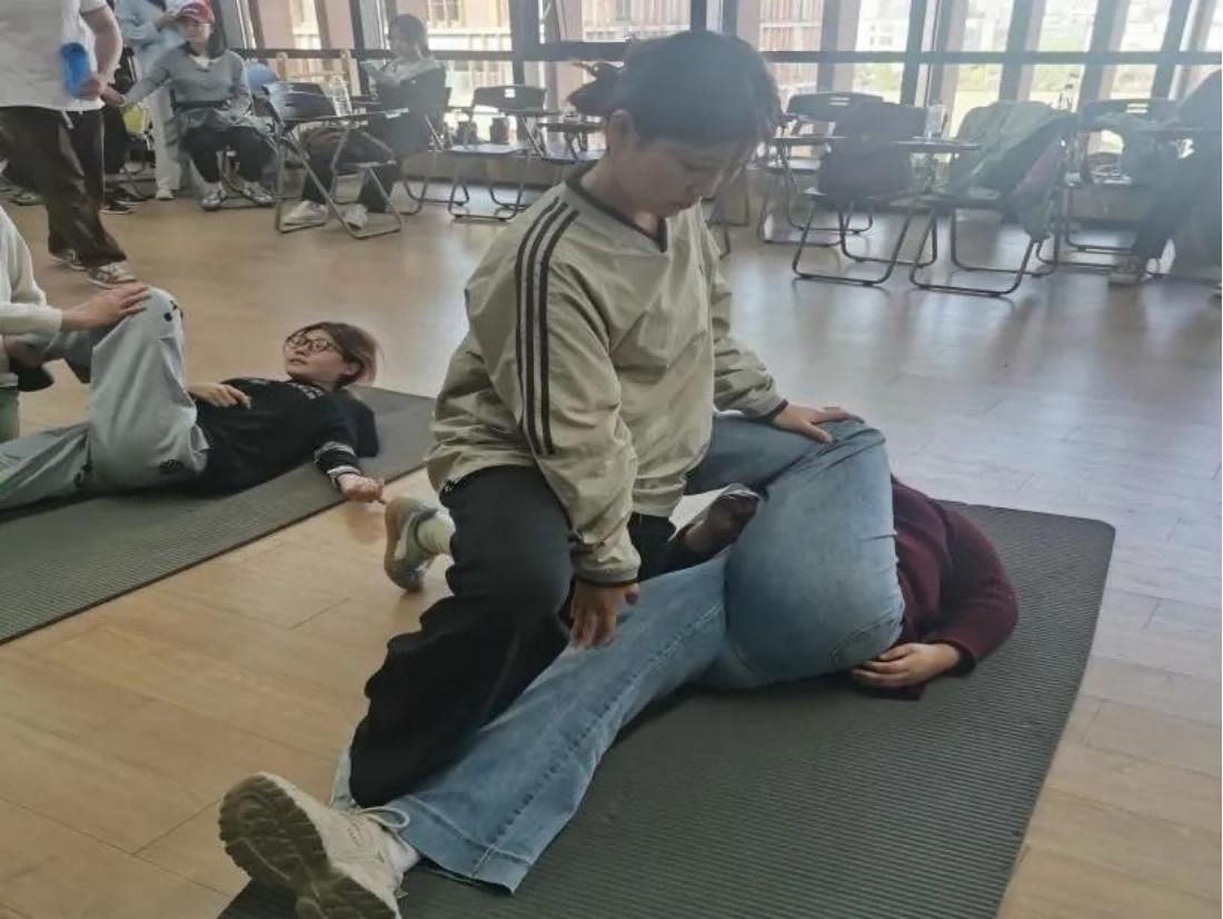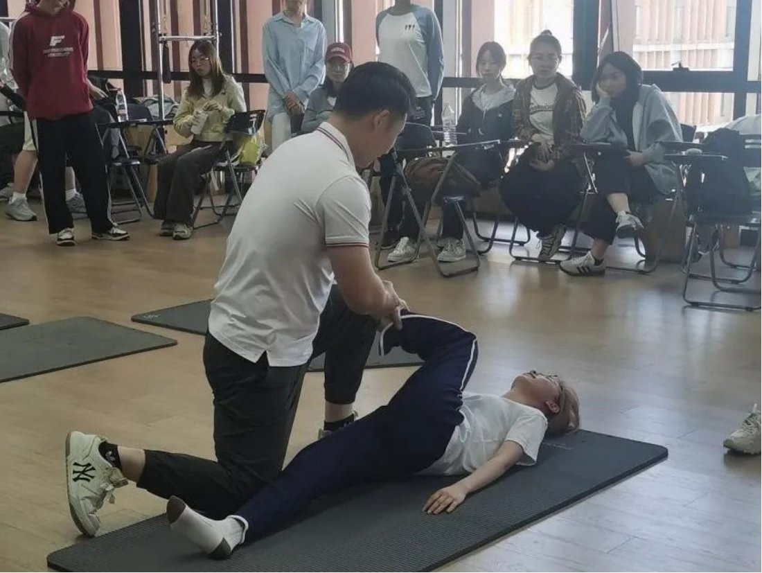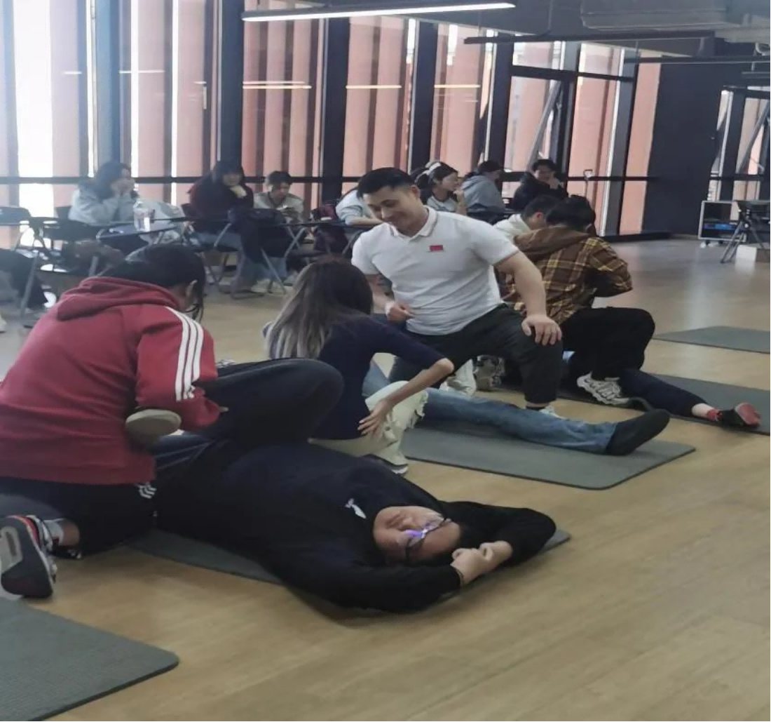 在评估中,针对柔韧性受限的同学,两位教练现场评估,并提供干预策略,向同学们示范了屈膝拉伸臀肌技术。同学们积极响应,纷纷加入到体验的队伍中,两位教练耐心的帮助同学们示范和纠正动作,要求受试同学腰部保持自然曲度,并融入肌肉能量技术(MET)进行阻抗调节,在拉伸过程中会不断询问同学1-10的主观疼痛评分。“看似简单的拉伸,自己做起来也不简单,原来需要这么多的动作技巧”同学在实操后纷纷感叹。两位老师鼓励同学们只要多体验、多实践、多上手,就一定能提高运动康复技巧。