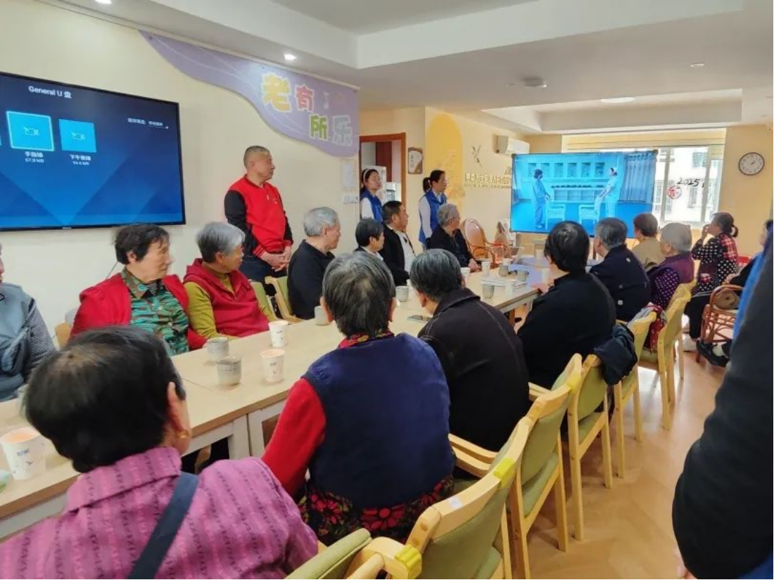 在视频教学环节,志愿者们播放了平衡训练小游戏以及太极拳的科普视频,激发了大家对日常锻炼的新灵感。最后,在太极拳的舒缓节奏中,志愿者细致讲解了搂膝拗步”“如封似闭等经典动作的要领与功效,带领大家一同体验太极的静谧与力量